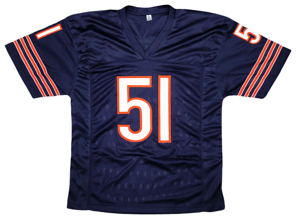 This is a Blue Jersey that has been hand signed by Dick Butkus. This is a custom jersey with no name brand. The approximate size is XL. It has nice sewn in name and numbers. This item has been witnessed and certified authentic by Beckett Authentication (BAS) and comes with their tamper-proof witness sticker. Beckett Authentication has recently changed their physical certificate card policy where they no longer match their tamper-proof sticker with a physical certificate. A certificate can be printed on Beckett's website for the matching authentication number.