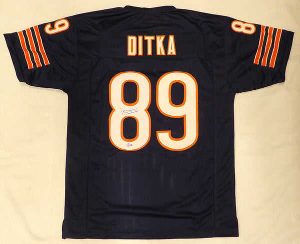 This is a Blue Jersey that has been hand signed by Mike Ditka. This is a custom jersey with no name brand. The approximate size is XL. It has nice sewn in name and numbers. There are marks on the item as shown. This item has been certified authentic by Beckett Authentication (BAS) and comes with their tamper-proof QR Code hologram that can be verified on the Beckett-authentication.com.