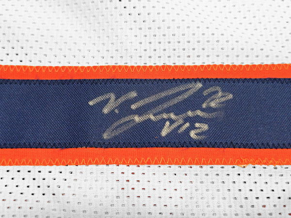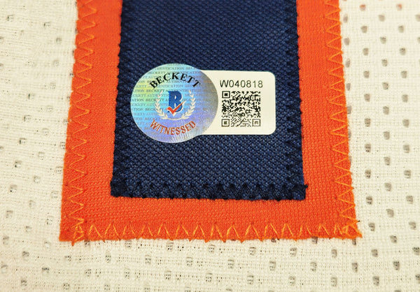 This is a White Jersey that has been hand signed by Velus Jones Jr. This is a custom jersey with no name brand. The approximate size is XL. It has nice sewn in name and numbers. This item has been witnessed and certified authentic by Beckett Authentication (BAS) and comes with their tamper-proof witness hologram.