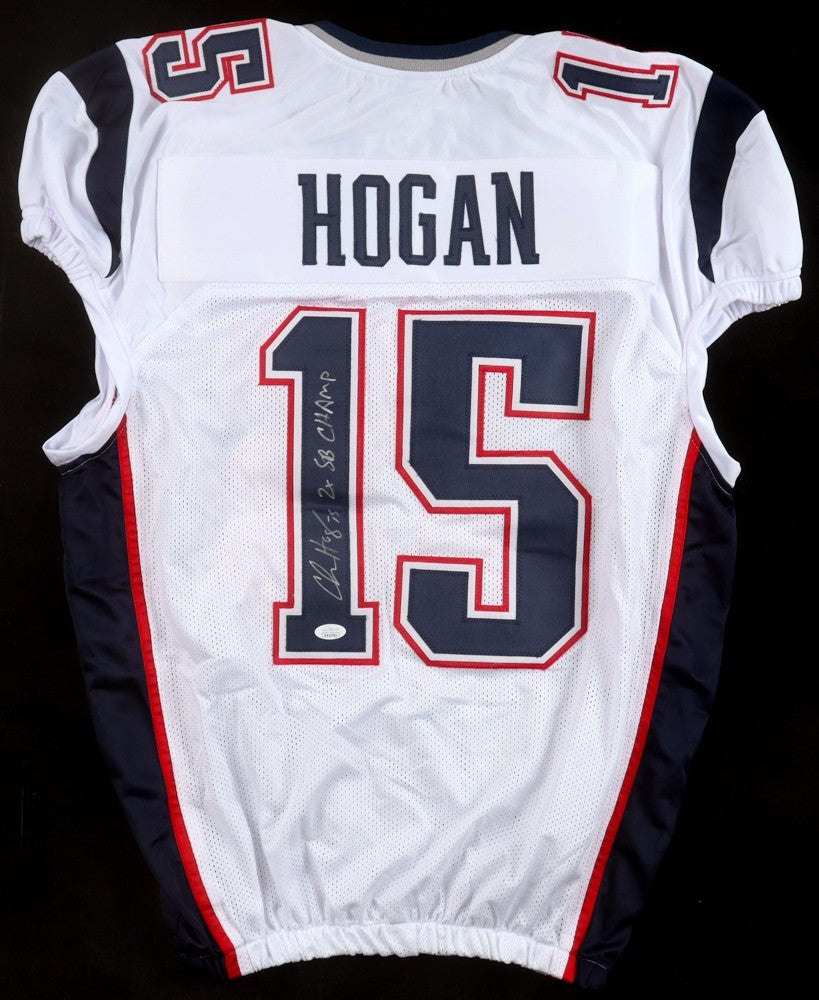 Custom on-field style Pro Cut jersey, everything is sewn on, size XL. Hand-signed and inscribed by Chris Hogan.The autograph(s) includes an official James Spence Authentication (JSA) hologram and scannable QR Code card for authenticity purposes. The signing of this item was witnessed by JSA.Authentication: JSA Hologram with Scannable QR Code card