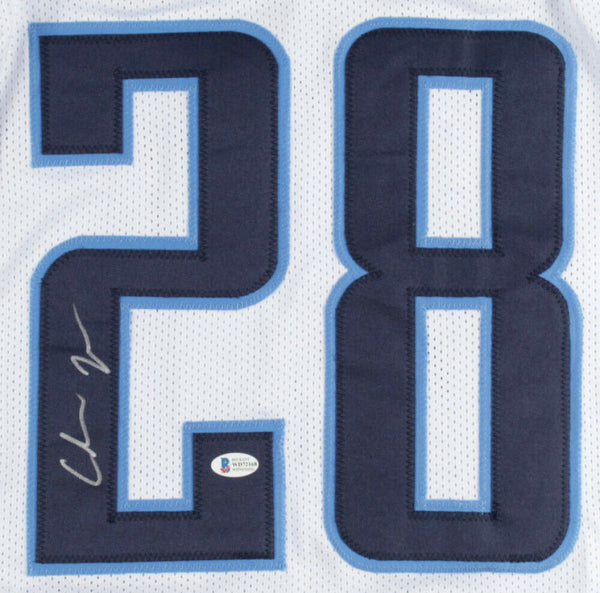 Custom on-field style jersey. Everything is sewn on, size XL. Has been hand-signed by Chris Johnson.The lot / autograph(s) includes an official Beckett Authentication Services serially-numbered hologram and matching COA for authenticity purposes. The signing of this item was witnessed by Beckett.Authentication: Beckett COA