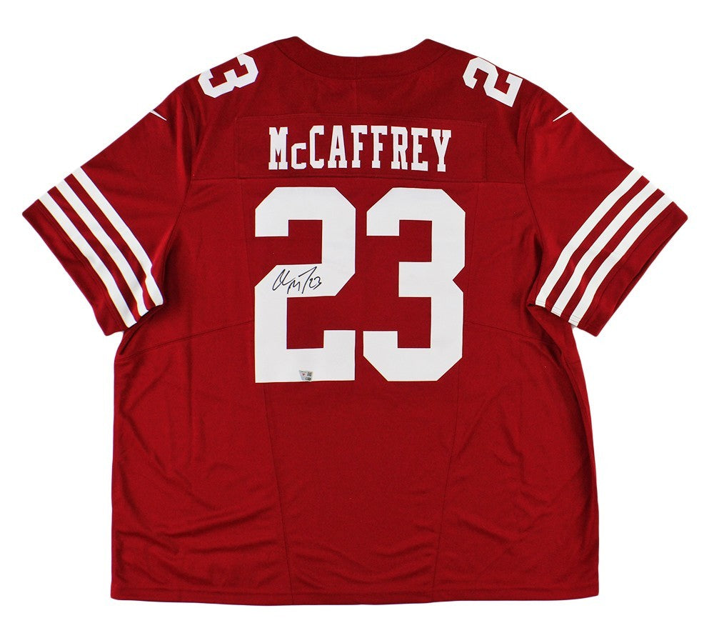 A San Francisco 49ers Nike Limited Red NFL Jersey hand signed by Christian McCaffrey. The item and signature are in excellent condition. Christian was drafted by the Carolina Panthers in the First Round of the 2017 Draft. He played college football at Stanford. He has been Pac-12 Offensive Player of the Year and the Heisman Trophy runner up. - AUTHENTICATION: The item features a Fanatics Authentic Serial Numbered and Databased Hologram