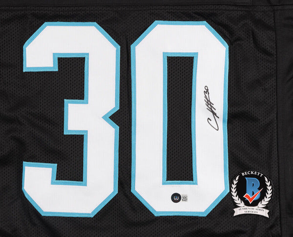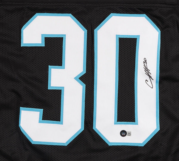 Custom on-field style jersey. Everything is sewn on, size XL. Hand-signed in black felt-tip pen by Chuba Hubbard. The lot / autograph(s) includes an official Beckett Authentication Services serially numbered hologram for authenticity purposes.Authentication: Beckett Hologram