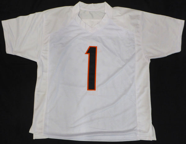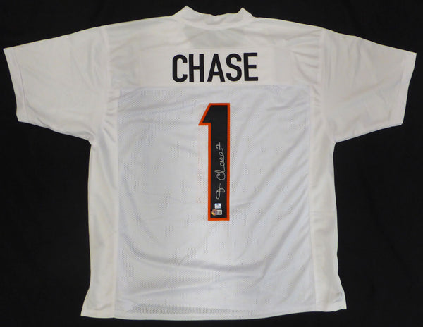 This is a White Jersey that has been hand signed by Ja'Marr Chase. This is a custom jersey with no name brand. The approximate size is XL. It has nice sewn in name and numbers. NOTE: There is a stain on the jersey, as shown in the pictures. This item has been certified authentic by Beckett Authentication (BAS) and comes with their tamper-proof QR Code sticker that can be verified on the Beckett-authentication.com.