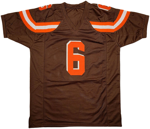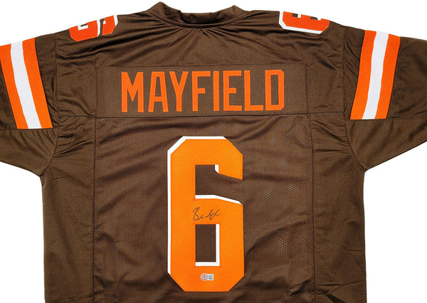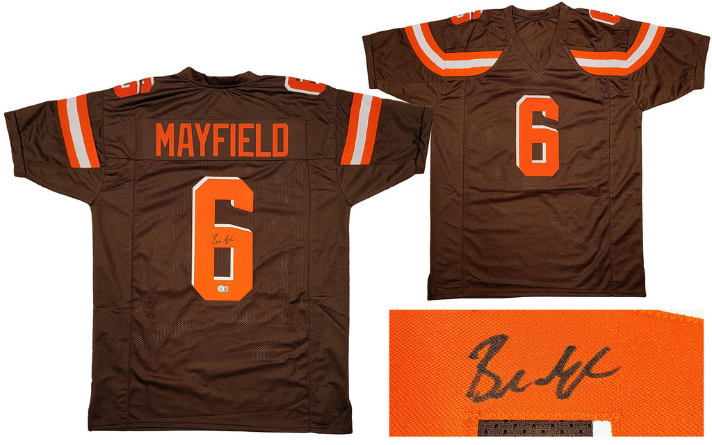 This is a Brown Jersey that has been hand signed by Baker Mayfield. This is a custom jersey with no name brand. The approximate size is XL. It has nice sewn in name and numbers. This item has been certified authentic by Beckett Authentication (BAS) and comes with their tamper-proof QR Code sticker that can be verified on the Beckett-authentication.com.