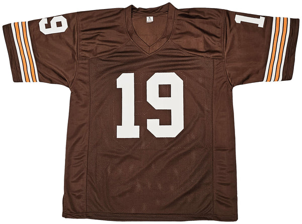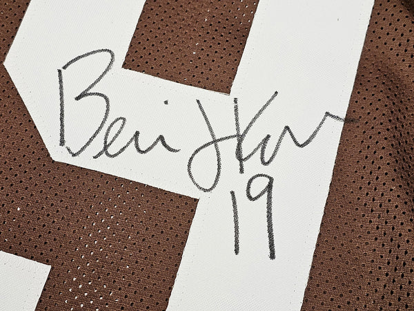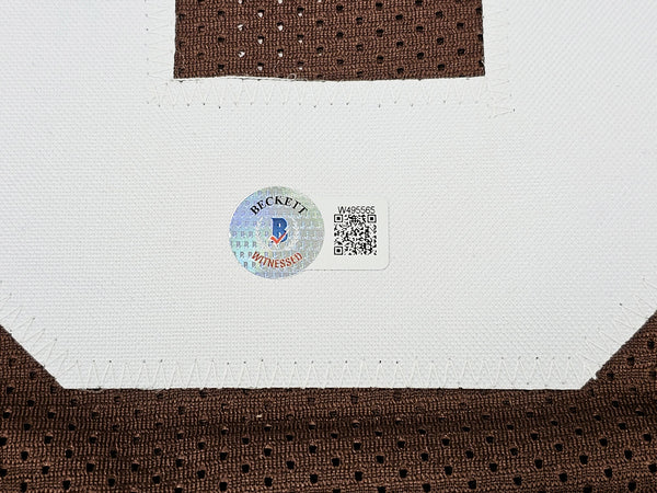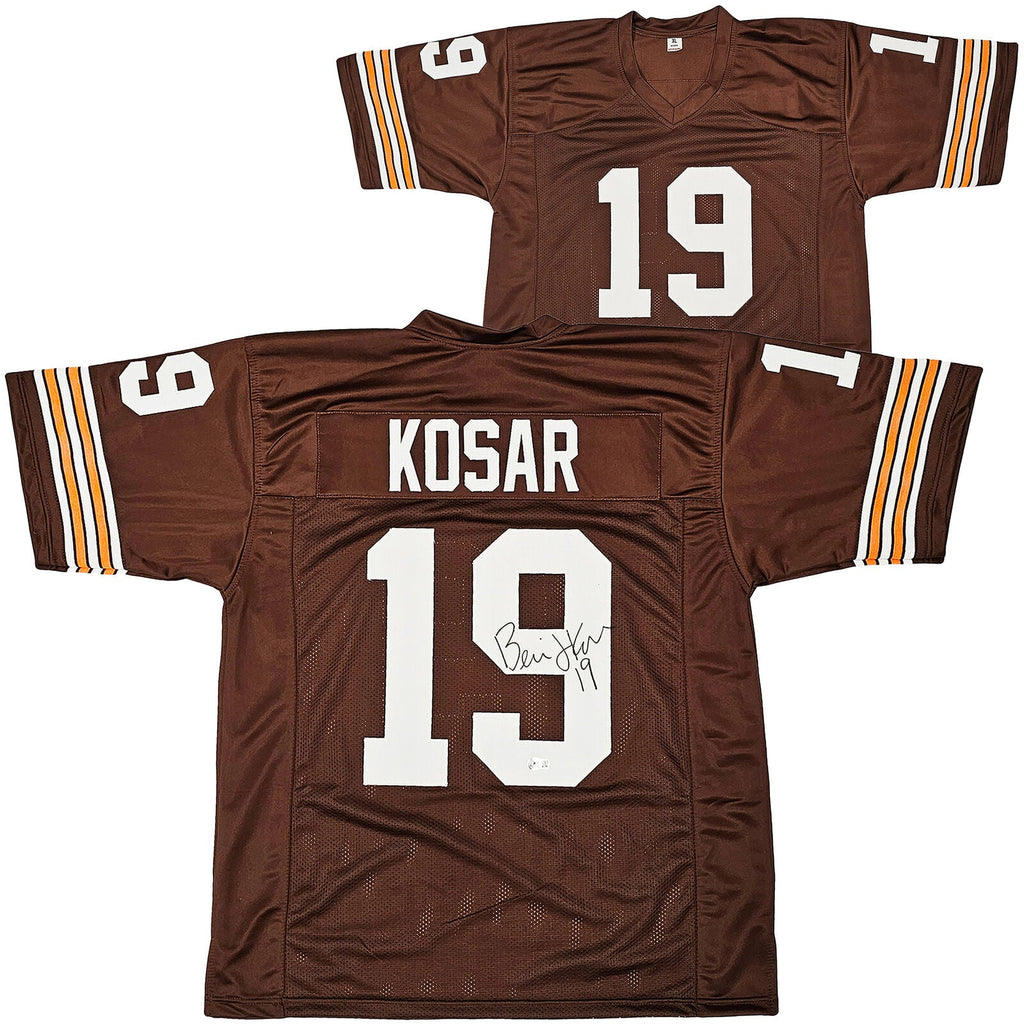 This is a Brown Jersey that has been hand signed by Bernie Kosar. This jersey is specially made without any recognizable brand. It is approximately sized as XL and features well-stitched name and numbers. This item has been witnessed and certified authentic by Beckett Authentication (BAS) and comes with their tamper-proof witness sticker. Beckett Authentication has recently changed their physical certificate card policy where they no longer match their tamper-proof sticker with a physical certificate. A certificate can be printed on Beckett's website for the matching authentication number.