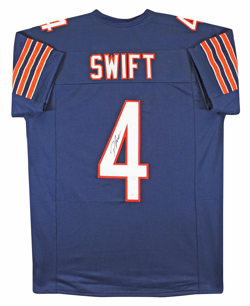 This Autographed Navy Pro Style Jersey has been Personally Signed by D'Andre Swift of the Chicago Bears. This item is 100% Authentic to include a Certificate of Authenticity (COA) / hologram by JSA. We conducted an autograph signing with D'Andre Swift where multiples of the same item were signed. While the photographs are representative of this item, the size, placement and strength of the signature may vary. Each item is hand signed, therefore, each autograph is unique. This item can be verified through JSA. This is a X-Large sized, non-branded, custom-stitched Jersey.