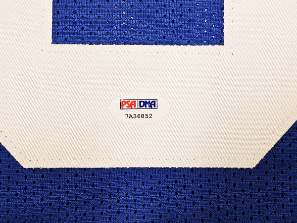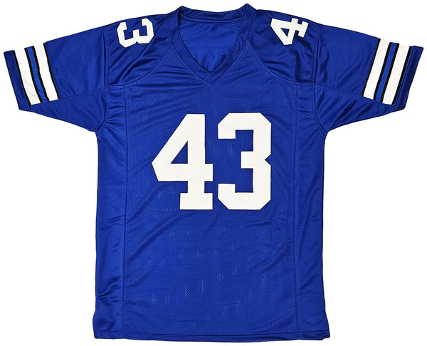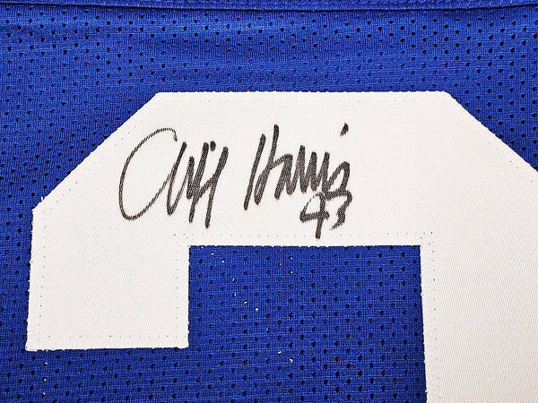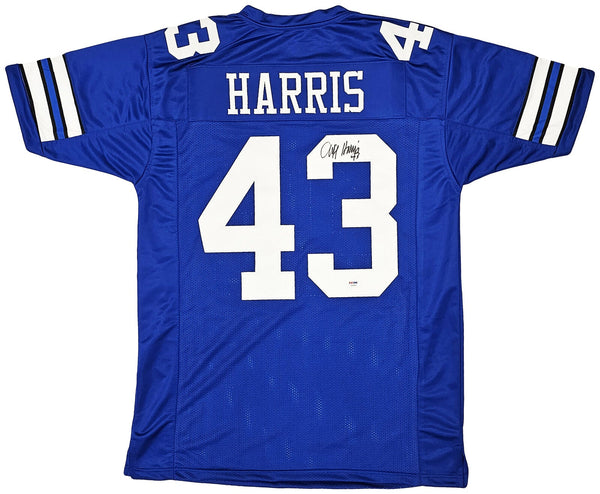 This is a Blue Jersey that has been hand signed by Cliff Harris. This is a custom jersey with no name brand. The approximate size is XL. It has nice sewn in name and numbers. This item has been certified authentic by PSA/DNA and comes with their tamper-proof sticker and matching certificate of authenticity.