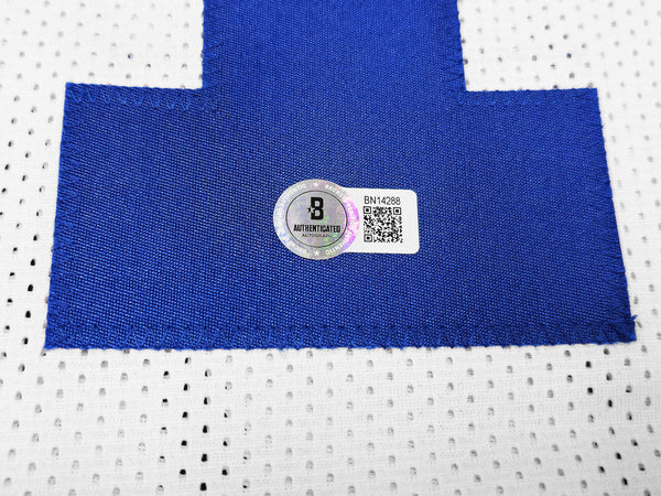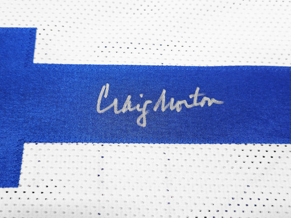 This is a White & Blue Jersey that has been hand signed by Craig Morton. This is a custom jersey with no name brand. The approximate size is XL. It has nice sewn in name and numbers. This item has been certified authentic by Beckett Authentication (BAS) and comes with their tamper-proof QR Code sticker that can be verified on beckett-authentication.com.