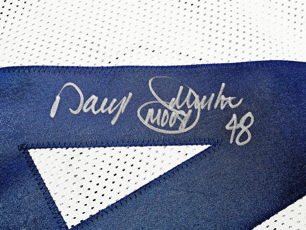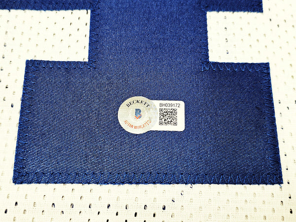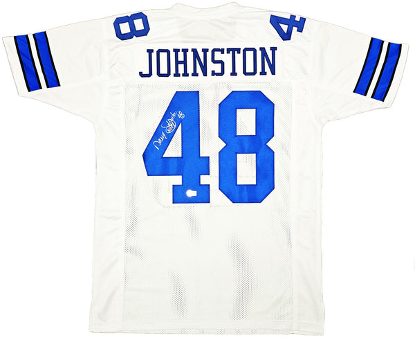 This is a White Jersey that has been hand signed by Daryl Johnston. This is a custom jersey with no name brand. The approximate size is XL. It has nice sewn in name and numbers. This item has been certified authentic by Beckett Authentication (BAS) and comes with their tamper-proof QR Code sticker that can be verified on beckett-authentication.com.