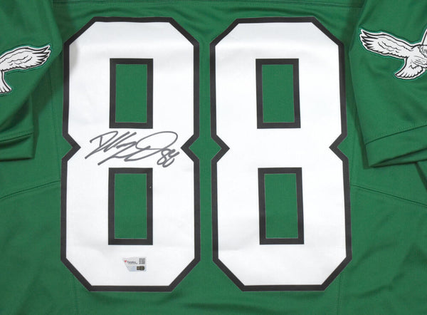 Dallas Goedert Autographed Philadelphia Eagles Kelly Green Nike Vapor Limited Jersey - Fanatics *Black This is a Dallas Goedert hand autographed Nike Game jersey. This item has a Fanatics Authentication, which comes with a Fanatic numbered sticker hologram and QR code for verification. You can view this item on the Fanatic Authentication website to see when and where it was signed. It was signed either at a public autograph appearance or a private signing. This is a stock photo of the item. Although you may not receive this exact item, the item you receive is virtually identical, brand new, and in great shape. Jersey size is XL.
