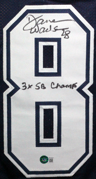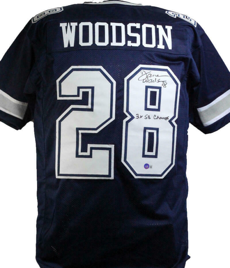 Darren Woodson Autographed Blue w Wte Num Pro Style Jersey Insc- Beckett W *Blk THIS IS NOT AN NFL JERSEY. THIS HAS NO TAGS, NO LOGOS, NO EMBLEMS. This is a Darren Woodson of the Dallas Cowboys hand autographed custom made (Non Name Brand) authentic style (Stitched Letters and Numbers) jersey inscribed with "3x SB Champs". This item has a Beckett Witnessed Authentication, which comes with a numbered and a matching Certificate of Authenticity. You can view this item on the Beckett website, it shows when and where the item was signed. It was signed either at a public autograph appearance or a private signing. This is a stock photo of the item. Although you may not receive this exact item, the item you receive is virtually identical, brand new, and in great shape. Jersey size is XL.