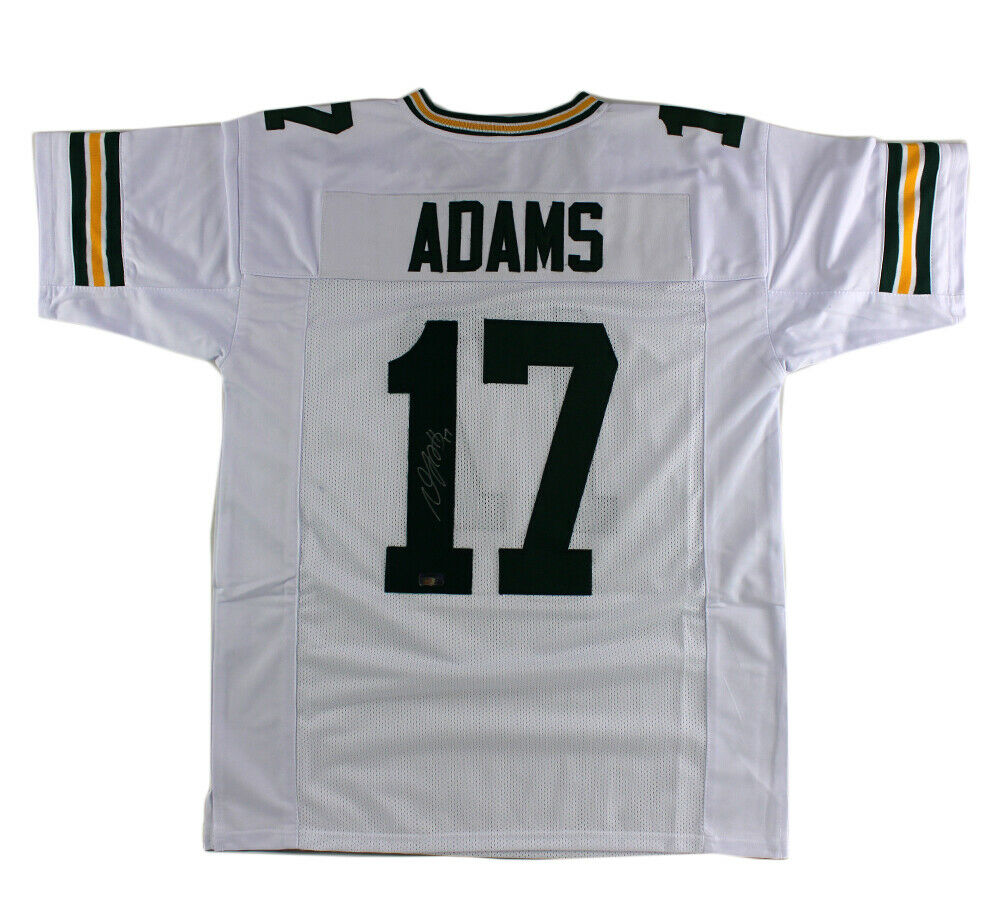 A Green Bay Custom White Jersey hand signed by Davante Adams. The item and signature are in excellent condition. Davante is a wide receiver for the Green Bay Packers of the NFL. He played college football at Fresno State, and was selected by the Packers in the second round of the 2014 NFL Draft. AUTHENTICATION: The item is accompanied by a Certificate of Authenticity - Serial Numbered and Databased Hologram