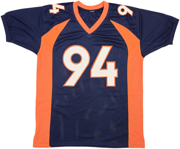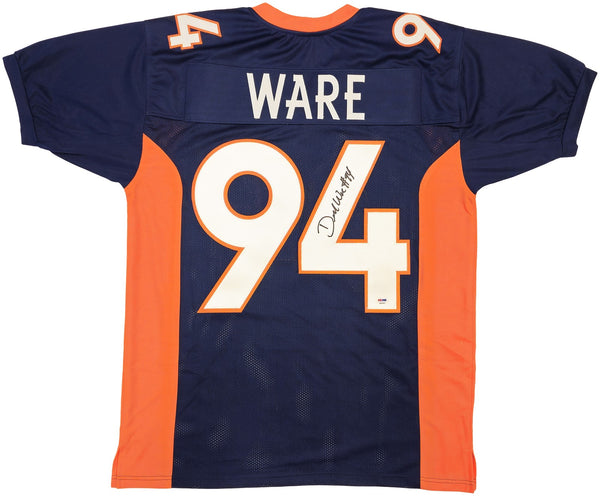 This is a Blue Jersey that has been hand signed by DeMarcus Ware. This is a custom jersey with no name brand. The approximate size is XL. It has nice sewn in name and numbers. This item has been certified authentic by PSA/DNA and comes with their tamper-proof hologram and matching certificate of authenticity.
