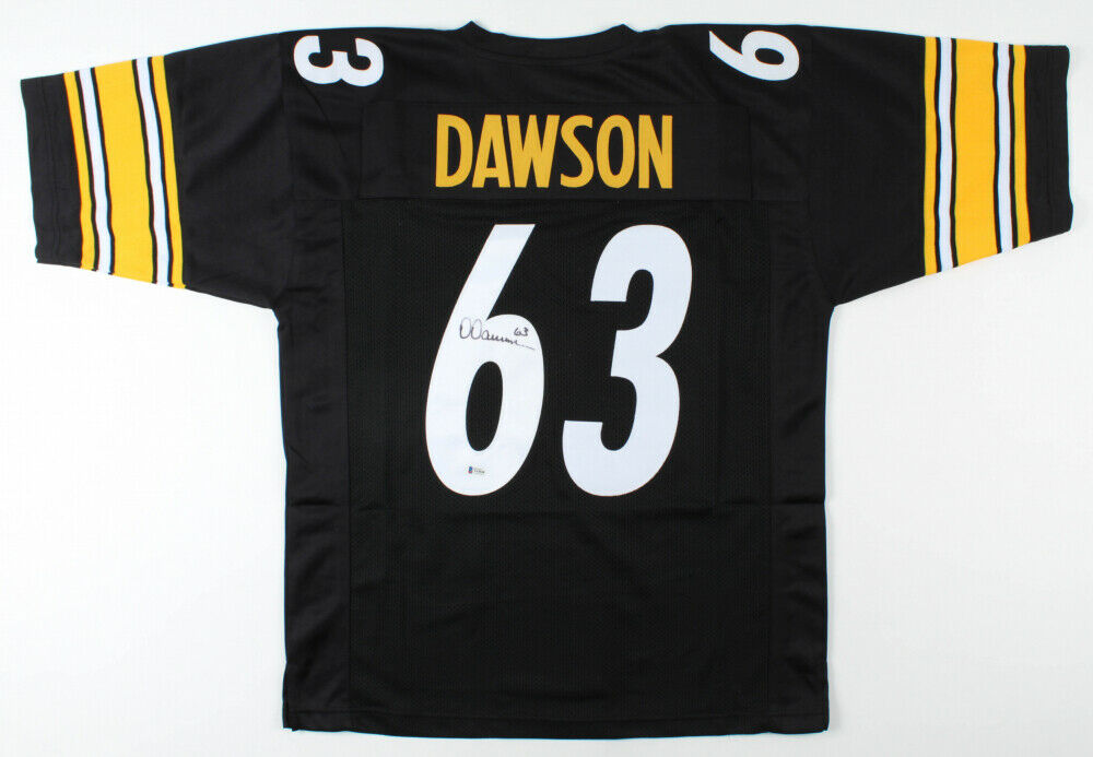 Custom on-field style jersey. Everything is sewn on, size XL. Hand-signed by Dermontti Dawson (HOF).The lot / autograph(s) includes an official Beckett Authentication Services serially numbered hologram and matching COA for authenticity purposes.Authentication: Beckett COA