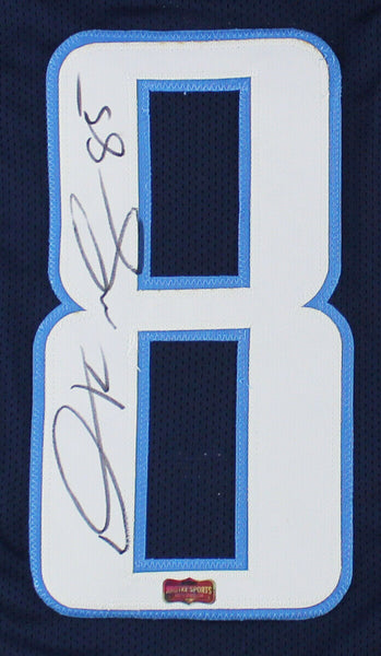 An Tennessee Custom Navy Blue Jersey Signed by Derrick Mason. The item and signature are in excellent condition. Derrick was drafted in 1997 in Round:4 and was in Pick:98. Derrick is a 2xPro Bowl(2000,2003). Derrick plays as a Wide Receiver for his position. Derrick First-Team ALL-Pro (2000). Derrick was a Receiving Yards would be 12,061. AUTHENTICATION: The item is accompanied by a Certificate of Authenticity - Serial Numbered and Databased Hologram - Picture of Derrick from the Signing