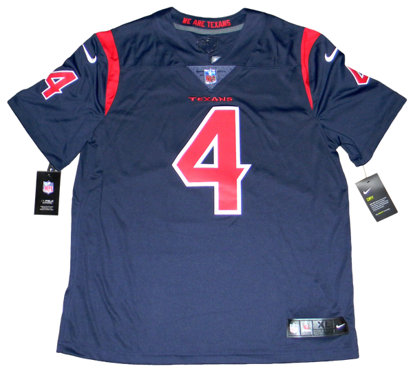 Deshaun Watson, former Pro Bowl quarterback for the Houston Texans, has hand signed this navy Nike Limited jersey. Jersey is new with tags attached and all letters/numbers are sewn-on. This item comes with a certificate of authenticity (COA) from Beckett Authentication Services and was signed in the presence of one of their representatives. You will receive a serial-numbered COA along with a matching serial-numbered sticker on the jersey. The authenticity can be verified online by entering the serial number. Watson's official GTSM hologram is also on the jersey. Item pictured may not be the exact item you will receive. It will be similar quality, and we guarantee your satisfaction.