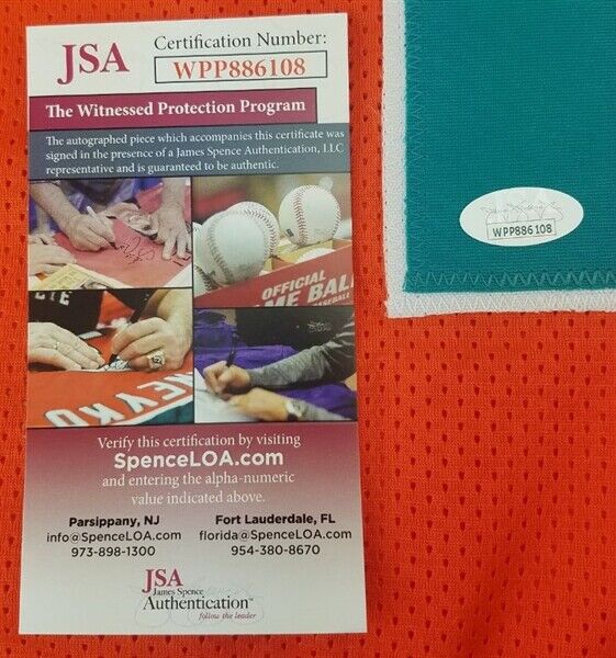 Custom on-field style jersey. Everything is sewn on, size XL. Hand-signed in Silver paint pen by DeVante Parker. The lot / autograph(s) includes an official James Spence Authentication (JSA) hologram and matching COA for authenticity purposes. The signing of this item was witnessed by JSA. Authentication: JSA COACustom on-field style jerseys are a more affordable option for autograph seekers. These jerseys do not have any brand name or tags and are made in the Philippines. They feature stitched on names and numbers and are made to look very similar to the on-field jerseys that the players wear. These custom jerseys are very commonly used in the memorabilia industry.