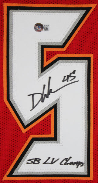 This Autographed Red Jersey with the inscription of "SB LV Champs" has been Personally Signed by Devin White of the Tampa Bay Buccaneers. This item is 100% Authentic to include a hologram by Beckett Authentication Services. This item will come with the new Beckett Authentication hologram that has a scannable QR code rather than the traditional COA. If you would like to have a COA, you are welcome to reach out to Beckett for a printed certification once you receive your item. This is a BAS Witnessed Protection Program item which means a Beckett Authentication Service representative was present when this item was being signed. This is a stock item. We conducted an autograph signing with Devin White and we have several of these available. The one you will receive will be of equal quality to the one pictured. This item can be verified through BAS Witnessed. This is a X-Large sized, non-branded, custom-stitched Jersey.