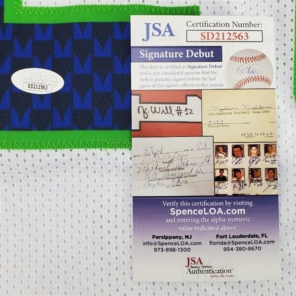This autographed jersey has been personally hand-signed by Devon Witherspoon of the Seattle Seahawks. This autograph is certified by James Spence Authentication's (JSA) Witnessed Protection Program. That means that a JSA representative was present when this item was signed. It comes with the numbered hologram and matching Certificate of Authenticity.Custom on-field style jerseys are a more affordable option for autograph seekers. These jerseys do not have any brand name or tags and are made in the Philippines. They feature stitched on names and numbers and are made to look very similar to the on-field jerseys that the players wear. These custom jerseys are very commonly used in the memorabilia industry.
