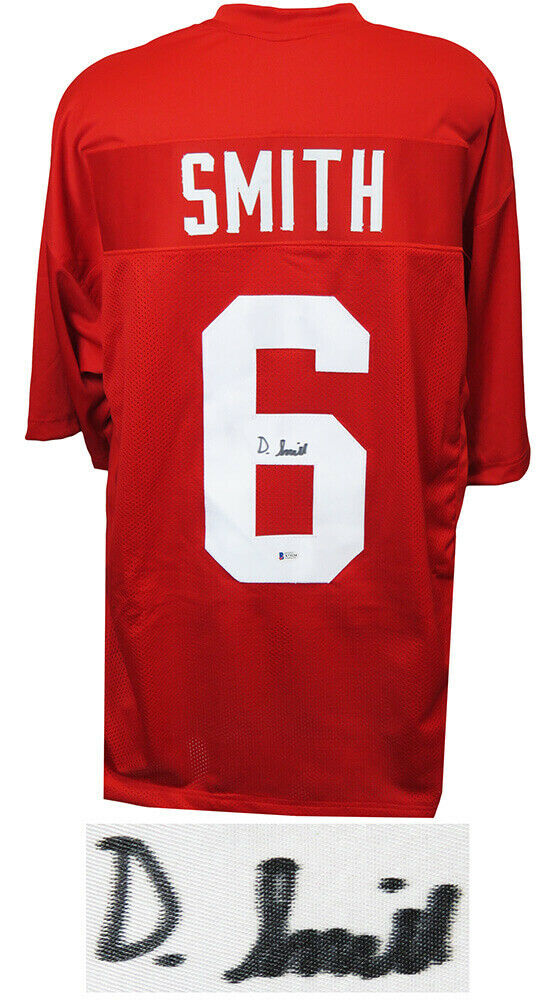 Devonta Smith signed red custom college football jersey. Item comes with a Beckett Authentication tamper evident numbered sticker and matching Certificate of Authenticity which can be verified online. Jersey is size XL.