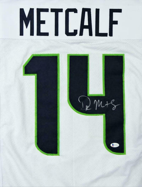 DK Metcalf Autographed White Pro Style Jersey - Beckett W *Silver *4 THIS IS NOT AN NFL JERSEY. THIS HAS NO TAGS, NO LOGOS, NO EMBLEMS. This is a DK Metcalf of the Seattle Seahawks hand autographed custom made (non name brand) authentic style jersey with stitched letters and numbers. This item has a Beckett Witnessed Authentication, which comes with a numbered sticker and a matching Beckett Certificate of Authenticity. You can view this item on the Beckett Authentication website, it shows when and where the item was signed. It was signed either at a public autograph appearance or a private signing. This is a stock photo of the item. Although you may not receive this exact item, the item you receive is virtually identical, brand new, and in great shape. Jersey size is XL.