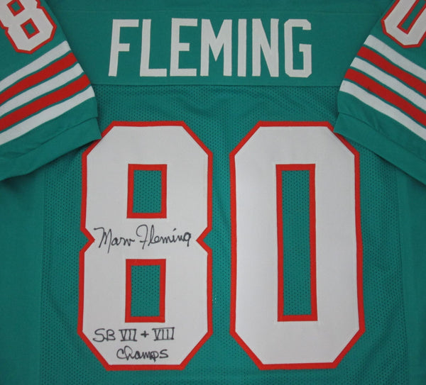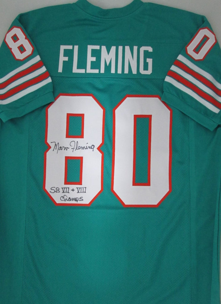 MIAMI DOLPHINS CUSTOM JERSEY of former DOLPHINS TIGHT END MARV FLEMING #80. This jersey is signed with Black sharpie and includes the inscription "SB VII & VIII Champs". This jersey is size XL and has all letters and numbers sewn/stitched on. This item was signed at a public signing with us and would make a great addition to any Dolphins collection. This autograph is guaranteed to be 100% authentic and will include a COA from Waukesha Sportscards with matching serial numbered holograms.