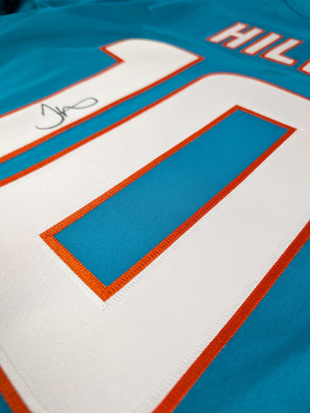 This Autographed w/ Sewn Numbers Teal Nike Jersey has been Personally Signed by Tyreek Hill of the Miami Dolphins. This item is 100% Authentic to include a hologram by Beckett Authentication Services. This item will come with an affixed Beckett Authentication Services (BAS) authentication sticker, which includes a scannable QR code to verify authenticity. Please note that Beckett no longer provides serial-numbered COA cards, and the attached BAS sticker will serve as the complete authentication for this item. This is a BAS Witnessed Protection Program item which means a Beckett Authentication Service representative was present when this item was being signed. We conducted an autograph signing with Tyreek Hill where multiples of the same item were signed. While the photographs are representative of this item, the size, placement and strength of the signature may vary. Each item is hand signed, therefore, each autograph is unique. This item can be verified through BAS Witnessed. This is a Large sized Jersey.