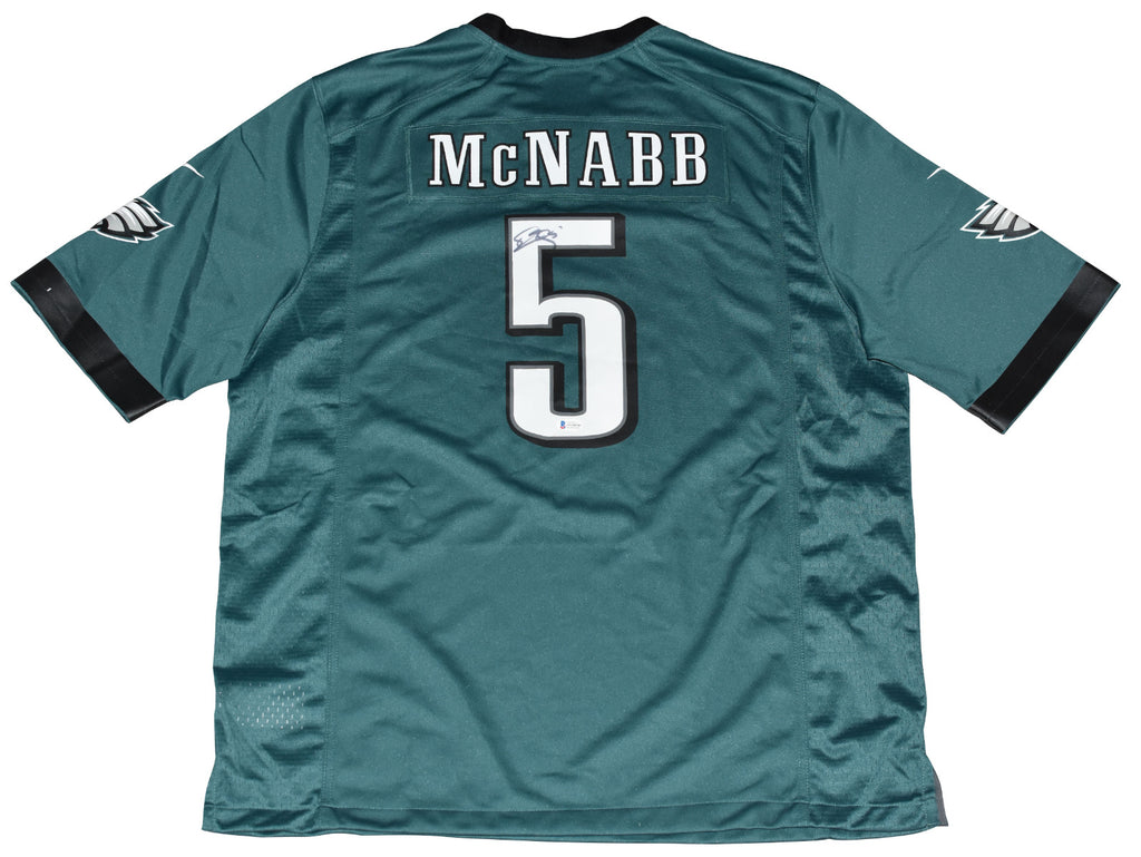 Donovan McNabb, former star quarterback for the Philadelphia Eagles, has hand signed this Nike replica jersey. Jersey is new/unworn and all letters/numbers are screen print. This item comes with a certificate of authenticity (COA) from Beckett Authentication Services and was signed in the presence of one of their representatives. You will receive a serial-numbered COA along with a matching serial-numbered sticker on the jersey. The authenticity can be verified online by entering the serial number.Item pictured may not be the exact item you will receive. It will be similar quality, and we guarantee your satisfaction.