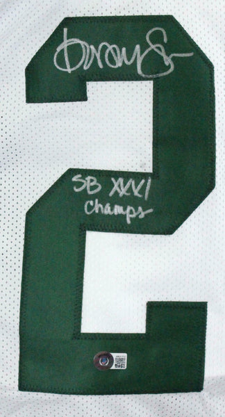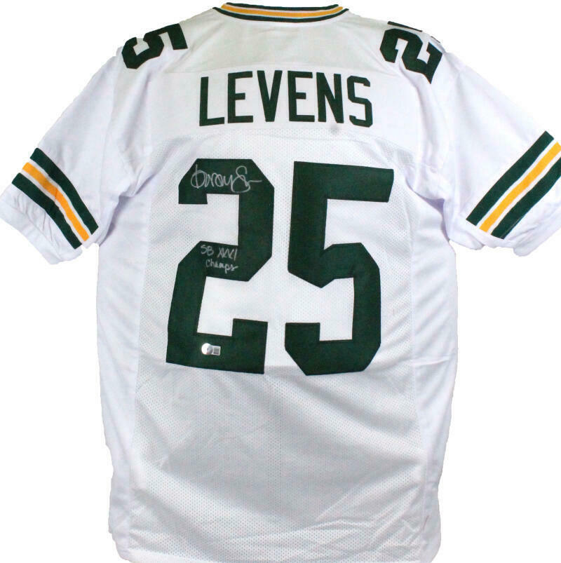 Dorsey Levens Autographed White Pro Style Jersey w/SB Champs-Beckett W Hologram *Silver THIS IS NOT AN NFL JERSEY. THIS HAS NO TAGS, NO LOGOS, NO EMBLEMS. This is a hand autograph of Dorsey Levens on a Custom Made (non name brand) Authentic Style Jersey with stitched letters and numbers. Inscribed SB Champs. This item has a Beckett Witnessed Authentication, which comes with a numbered hologram and a generic Beckett Certificate of Authenticity. You can view this item on the Beckett website, it shows when and where the item was signed. It was signed either at a public autograph appearance or a private signing. This is a stock photo of the item. Although you may not receive this exact item, the item you receive is virtually identical and brand new in great shape. Jersey size is XL.