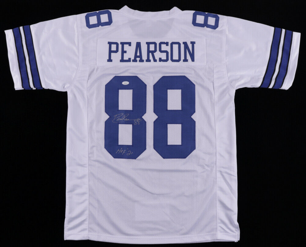 Custom on-field style jersey. Everything is sewn on, size XL. Has been hand-signed by Drew Pearson (HOF).The lot / autograph(s) includes an official James Spence Authentication (JSA) hologram and matching COA for authenticity purposes. The signing of this item was witnessed by JSA.Authentication: JSA COA