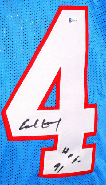 Earl Campbell Autographed Blue Pro Style Jersey w/ HOF - Beckett W Auth *4 THIS IS NOT AN NFL JERSEY. THIS HAS NO TAGS, NO LOGOS, NO EMBLEMS. This is a hand autographed Jersey of Earl Campbell on a Custom Made (non name brand) Authentic Style Jersey with stitched letters and numbers. This item has a Beckett Witnessed Authentication, which comes with a numbered sticker and a matching Beckett Certificate of Authenticity. You can view this item on the Beckett Authentication website, it shows when and where the item was signed. It was signed either at a public autograph appearance or a private signing. This is a stock photo of the item. Although you may not receive this exact item, the item you receive is virtually identical and brand new in great shape. Jersey size is XL.