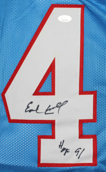 Earl Campbell Autographed Blue Pro Style Stat 4 Jersey With HOF- JSA W *Black THIS IS NOT AN NFL JERSEY. THIS HAS NO TAGS, NO LOGOS, NO EMBLEMS. This is an Earl Campbell of the Houston Oilers hand autographed custom made (Non Name Brand) authentic style (Stitched Letters and Numbers) jersey inscribed with HOF. This item has a James Spence Witnessed Authentication, which comes with a JSA numbered sticker and a matching JSA Certificate of Authenticity. You can view this item on the SpenceLOA website, it shows when and where the item was signed. It was signed either at a public autograph appearance or a private signing. This is a stock photo of the item. Although you may not receive this exact item, the item you receive is virtually identical, brand new, and in great shape. Jersey size is XL.