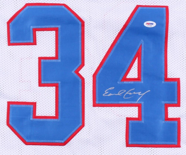 Custom on-field style jersey. Everything is sewn on, size XL. Hand-signed in silver paint pen by Earl Campbell (HOF). Campbell's career highlight stats have been custom stitched on the reverse side of the jersey below the numbers. The lot / autograph(s) includes an official PSA/DNA hologram and matching COA for authenticity purposes.Authentication: PSA COA