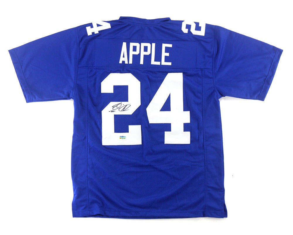A New York Custom Blue Jersey hand signed by Eli Apple. The item and signature are in excellent condition. Eli was drafted by the New York Giants in the First Round of the 2016 Draft. - AUTHENTICATION: The item features a Certificate of Authenticity, Serial Numbered and Databased hologram, and picture of Eli from the signing -