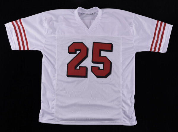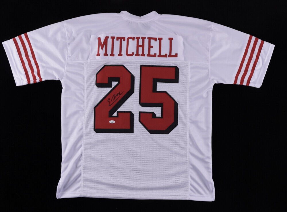 Custom on-field style jersey. Everything is sewn on, size XL. Hand-signed by Elijah Mitchell.The autograph(s) includes an official James Spence Authentication (JSA) "Signature Debut" hologram and COA. "Signature Debut" is the autographed memorabilia equivalent to a rookie card. The JSA definition of a "Signature Debut" is as follows: "Any item that is autographed and received by JSA prior to the last game of the signer's official rookie season.Authentication: JSA COA