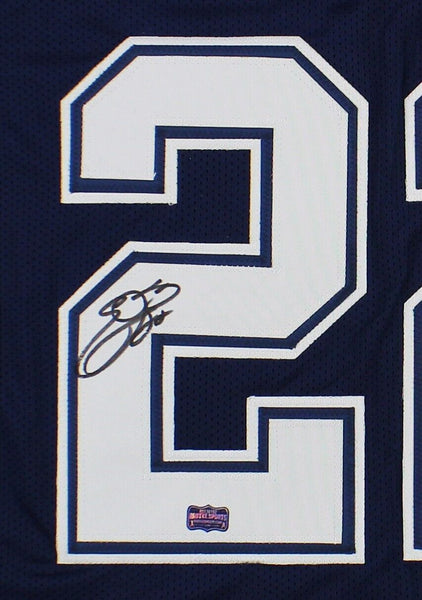 A Dallas Custom Blue Jersey hand signed by Emmitt Smith. The item and signature are in excellent condition - Emmitt is a Super Bowl Champion and Class of 2010 NFL Hall of Fame Inductee AUTHENTICATION: Your item is tagged with a SmarTag powered by Prova Technology, which gives you digital access to your items authentication records, which includes a proof picture from the signing.