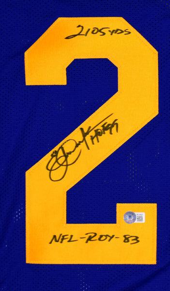 Eric Dickerson Autographed Blue Pro Style Jersey w/3 Insc.-Beckett W Hologram *Black THIS IS NOT AN NFL JERSEY. THIS HAS NO TAGS, NO LOGOS, NO EMBLEMS. This is an Eric Dickerson hand autographed custom made (non name brand) authentic style jersey (stitched letters and numbers) with "2105 yds, NFL ROY 83,HOF" inscription. This item has a Beckett Witnessed Authentication, which comes with a Beckett numbered hologram and a QR code for verification. You can view this item on the Beckett Authentication website, it shows when and where the item was signed. It was signed either at a public autograph appearance or a private signing. This is a stock photo of the item. Although you may not receive this exact item, the item you receive is virtually identical, brand new, and in great shape. Jersey size is XL.