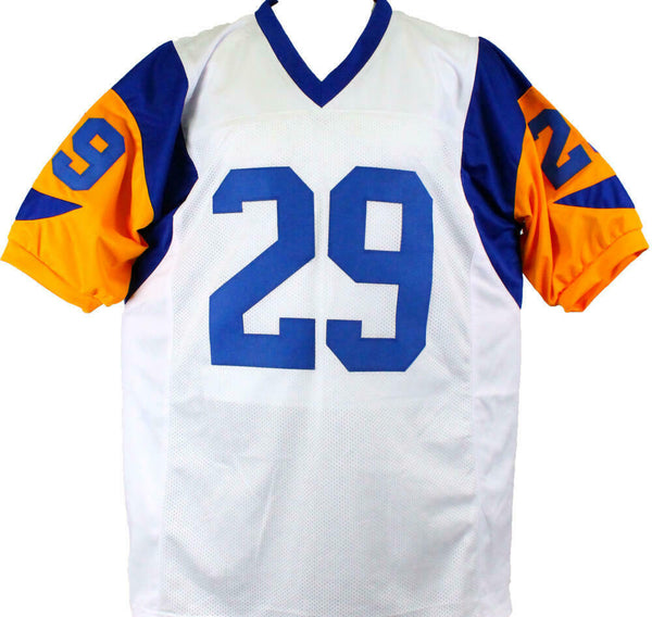 Eric Dickerson Autographed White Pro Style Jersey w/HOF-Beckett W Hologram *Silver THIS IS NOT AN NFL JERSEY. THIS HAS NO TAGS, NO LOGOS, NO EMBLEMS. This is an Eric Dickerson hand autographed custom made (non name brand) authentic style jersey (stitched letters and numbers) with "HOF" inscription. This item has a Beckett Witnessed Authentication, which comes with a Beckett numbered hologram and a QR code for verification. You can view this item on the Beckett Authentication website, it shows when and where the item was signed. It was signed either at a public autograph appearance or a private signing. This is a stock photo of the item. Although you may not receive this exact item, the item you receive is virtually identical, brand new, and in great shape. Jersey size is XL.
