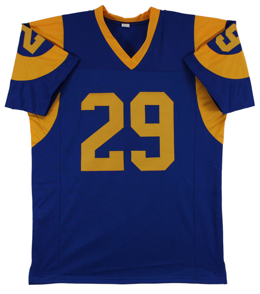 This Autographed Signed On #9 Blue Pro Style Jersey with the inscription of "HOF 99" has been Personally Signed by Eric Dickerson of the Los Angeles Rams. This item is 100% Authentic to include a hologram by Beckett Authentication Services. This item will come with an affixed Beckett Authentication Services (BAS) authentication sticker, which includes a scannable QR code to verify authenticity. Please note that Beckett no longer provides serial-numbered COA cards, and the attached BAS sticker will serve as the complete authentication for this item. This is a BAS Witnessed Protection Program item which means a Beckett Authentication Service representative was present when this item was being signed. We conducted an autograph signing with Eric Dickerson where multiples of the same item were signed. While the photographs are representative of this item, the size, placement and strength of the signature may vary. Each item is hand signed, therefore, each autograph is unique. This item can be verified through BAS Witnessed. This is a X-Large sized Jersey.