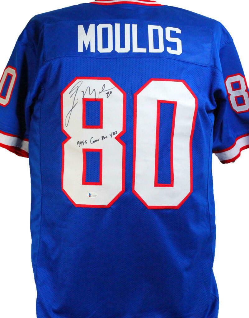Eric Moulds Autographed Blue Pro Style Jersey W/ Insc- Beckett W *Black THIS IS NOT AN NFL JERSEY. THIS HAS NO TAGS, NO LOGOS, NO EMBLEMS. This is a Eric Moulds of the Buffalo Bills hand autographed jersey with "9995 Career Rec Yards" inscription. This is a custom made (non name brand) authentic style jersey with stitched letters and numbers. This item has a Beckett Witnessed Authentication, which comes with a numbered and a matching Beckett Certificate of Authenticity. You can view this item on the Beckett Authentication website. It was signed either at a public autograph appearance or a private signing. This is a stock photo of the item. Although you may not receive this exact item, the item you receive is virtually identical, brand new, and in great shape. Jersey size is XL.