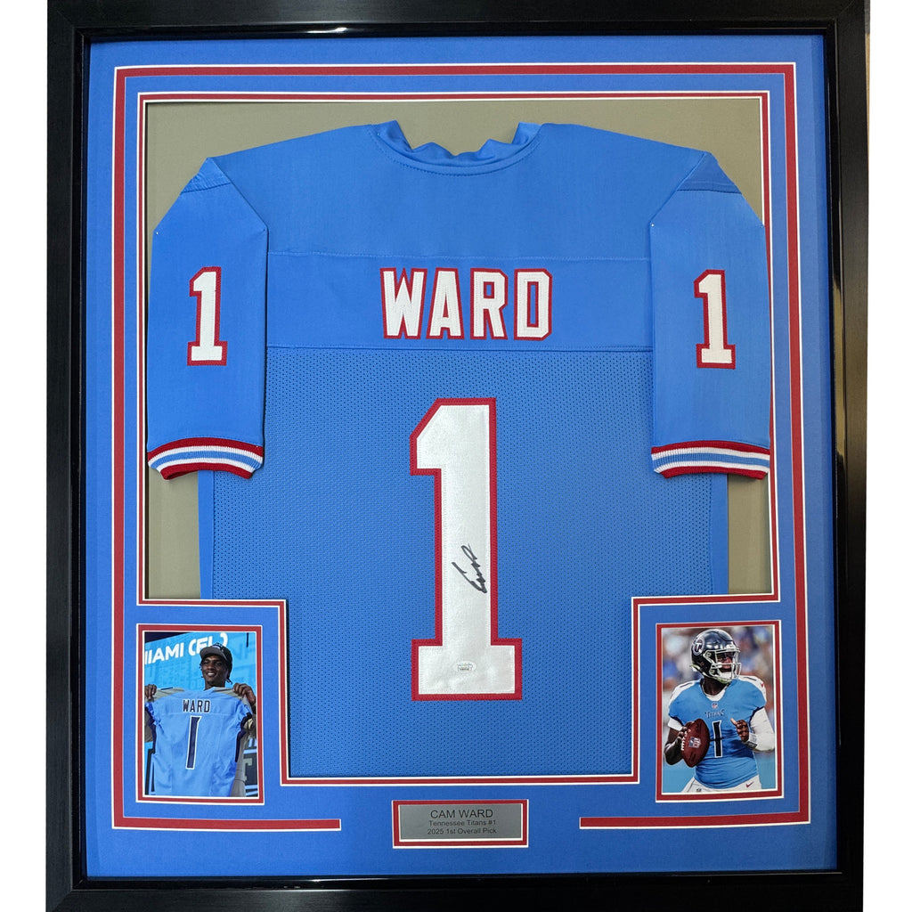 Framed Autographed/Signed Cameron Cam Ward 35x39 Retro Light Blue Jersey JSA COA The item is professionally framed and matted with two 5x7 photos, measures 35x39 inches and is ready to be hung in your man cave! Photo and matting requests can be made.