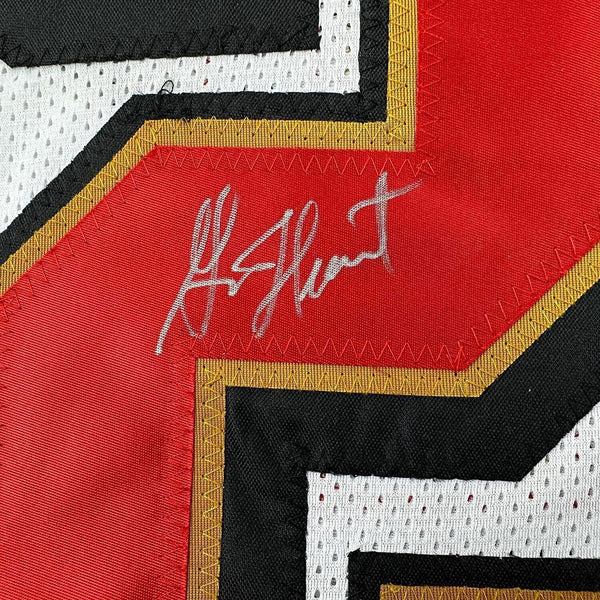 Framed Autographed/Signed Garrison Hearst 33x42 White Football Jersey JSA COA The item is professionally framed and matted with two 5x7 photos, measures 35 inches by 39 inches and is ready to be hung in your man cave! Photo and matting requests can be made.