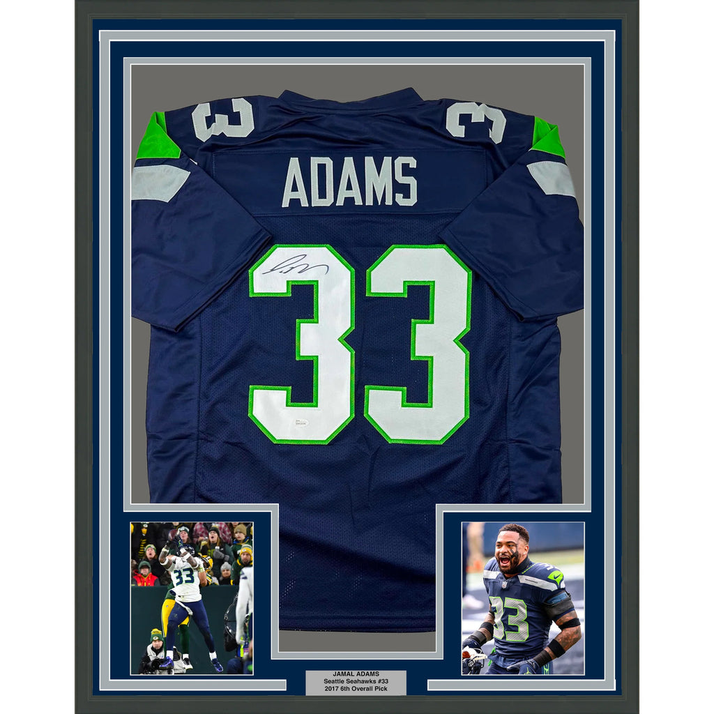 Framed Autographed/Signed Jamal Adams 33x42 Seattle Navy Blue Jersey JSA COA The item is professionally framed and matted with two 5x7 photos, measures 35 inches by 39 inches and is ready to be hung in your man cave! Photo and matting requests can be made.