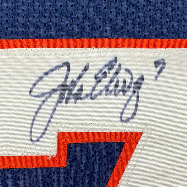 Framed Autographed/Signed John Elway 33x42 Denver Blue Football Jersey JSA COA