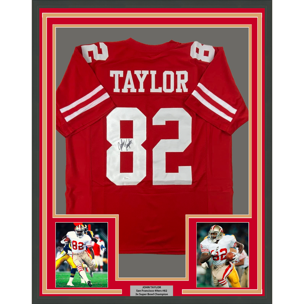 Framed Autographed/Signed John Taylor 33x42 San Francisco Red Jersey JSA COA The item is professionally framed & matted with two 8x10 photos, measures 33"x42" and is ready to be hung in your man cave! NOTE: COA card will be mounted on the back of the frame, not inside it on top of the jersey as seen in the picture.