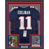 Framed Autographed/Signed Julian Edelman 33x42 New England Blue Jersey JSA COA The item is professionally framed and matted with two 5x7 photos, measures 35 inches by 39 inches and is ready to be hung in your man cave! Photo and matting requests can be made.