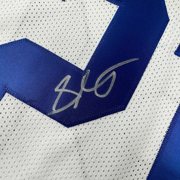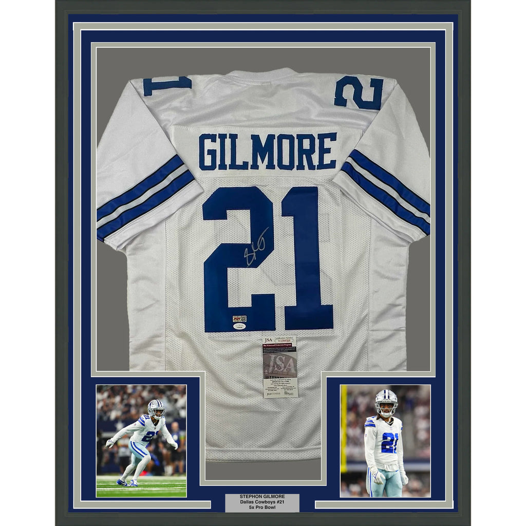 Framed Autographed/Signed Stephon Gilmore 33x42 Dallas White Jersey JSA COA The item is professionally framed and matted with two 5x7 photos, measures 35 inches by 39 inches and is ready to be hung in your man cave! Photo and matting requests can be made.
