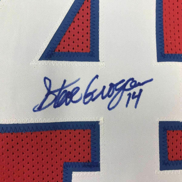 FRAMED Autographed/Signed STEVE GROGAN 33x42 New England Red Jersey JSA COA Auto The item is professionally framed & matted with two 8x10 photos, measures 33"x42" and is ready to be hung in your man cave! NOTE: COA card will be mounted on the back of the frame, not inside it on top of the jersey as seen in the picture.