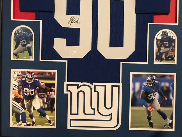 Custom Framed Jason Pierre-Paul hand signed New York Giants custom jersey. JSA Hologram and COA(#WP712381) The authentication is from JSA. This signature is authenticated by a representative of JSA! 100% AUTHENTIC!!! The jersey has fully stitched numbers on the front and back. It is a great item and a must for all great sports fans! This item is professionally framed, it measures 32"x40" inside , 42"x34" outside , using UV protective Acrylic glass for safe keeping and safe transport, team color matting, black moulding and hanging hooks on the back. All additional items in frame seen in pictures included. 100% ready to hang in your fan cave.